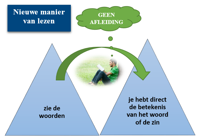 Deze methode activeert je ‘leescentrum’ en schakelt de ‘lees remmer’ uit. Je leest boeken visueel, vergelijkbaar met het kijken naar een film. Je slaat informatie op detailniveau op in je langetermijngeheugen.
